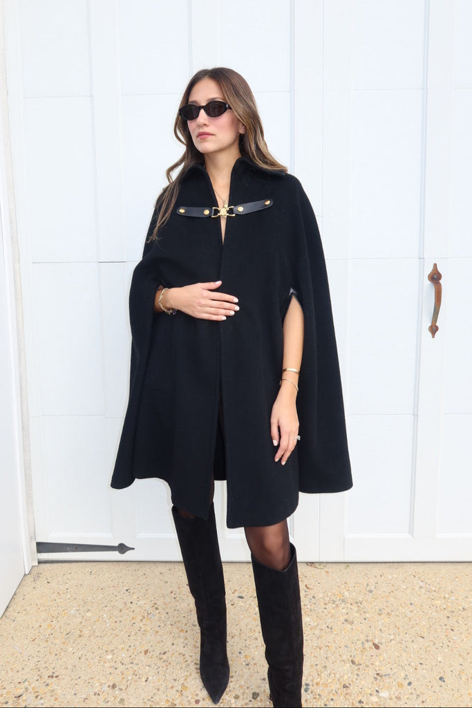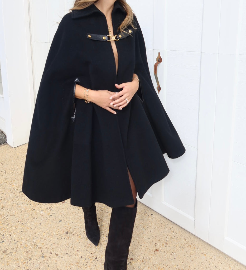 Vintage 1970s Céline black wool cape with a gold triomphe logo clasp buckle. A stunning and substantial piece.