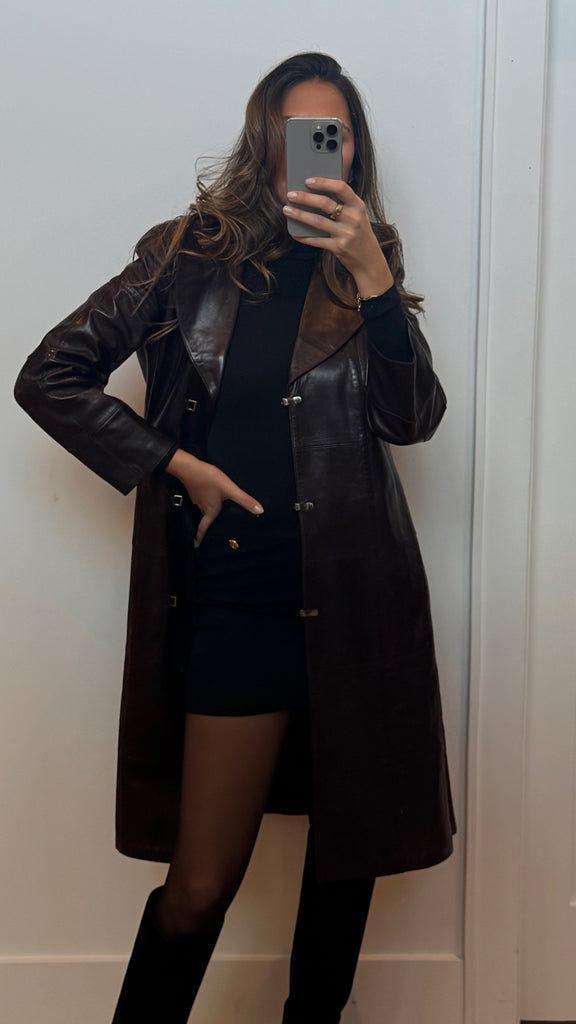 Chanel Fall 2000 burgundy leather coat with metal clasp closure buttons.