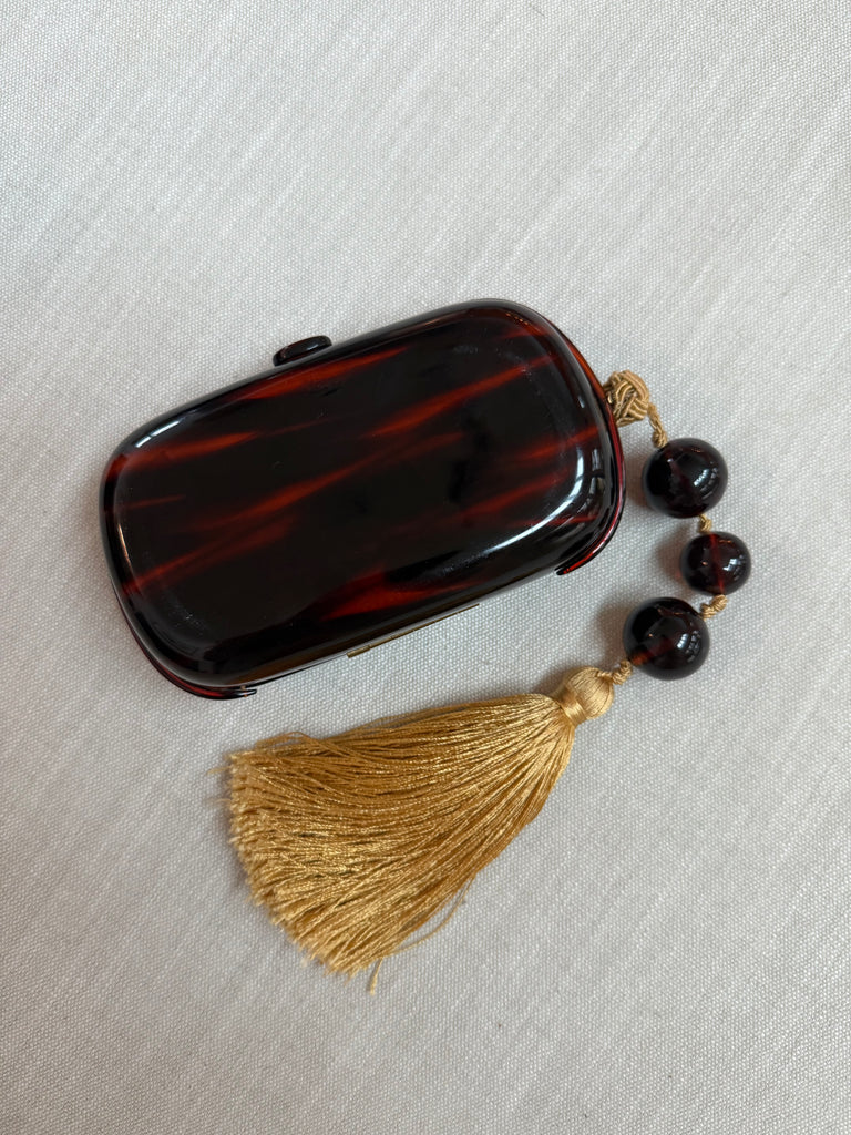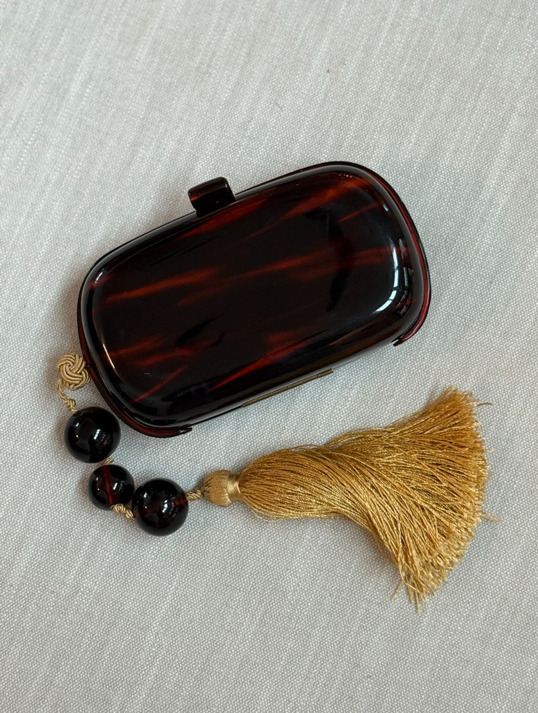 Vintage Bottega Veneta tortoiseshell-effect acrylic minaudière clutch with a braided-cord tassel strap.