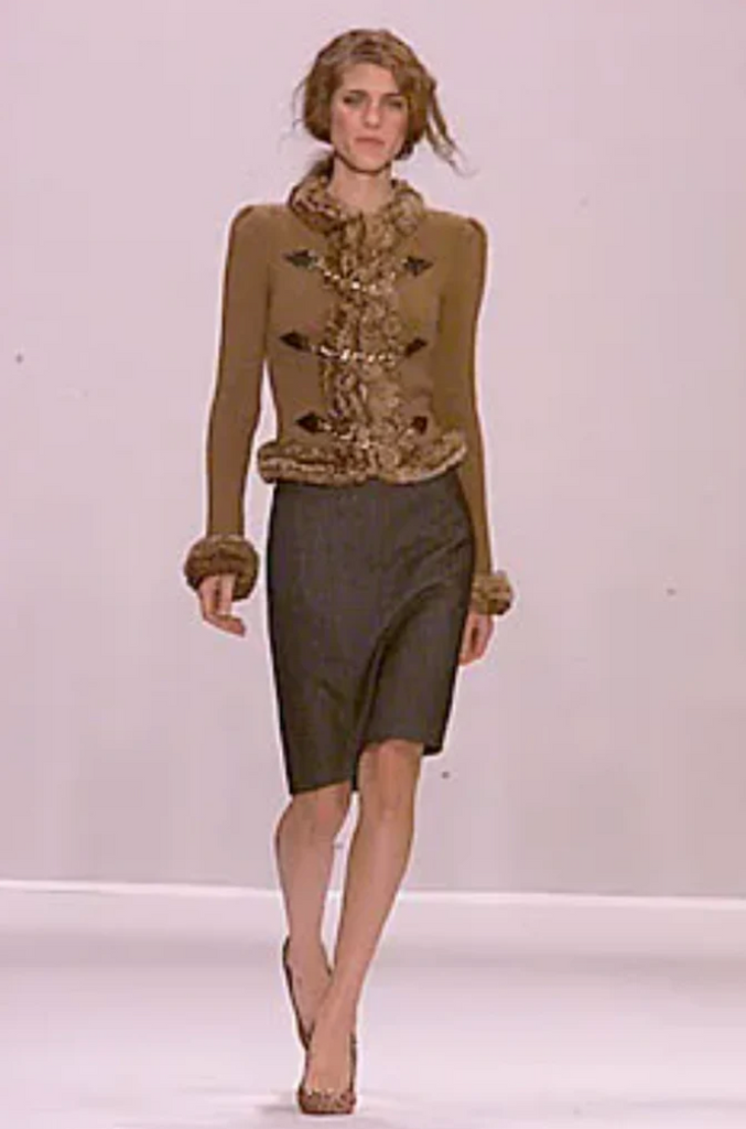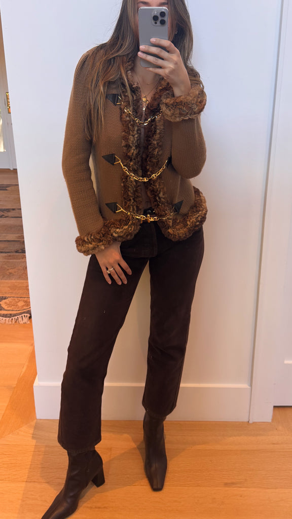 Vintage Céline cashmere cardigan from Fall/Winter 2000 Runway from Michael Kors era. It's composed of a brown cashmere knit with Orylag rabbit fur trimming and gold Céline Triomphe chain closures.