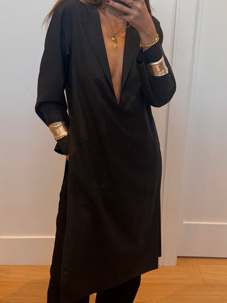 Vintage Yves Saint Laurent gray tunic with a tailored silhouette and deep-v neckline. Effortlessly chic with side slits, and an elongated fit.