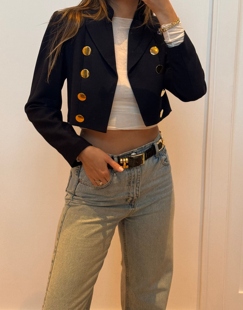 Vintage Yves Saint Laurent rare navy blue bolero jacket with eight large gold buttons.